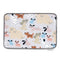 Keep mealtime tidy and floors spotless with the adorable Pooches & Pups Microfiber Pet Bowl Mat. This fun mat features a playful pattern of various dog breeds, including Poodles, Dalmatians, and Beagles, on a neutral background.