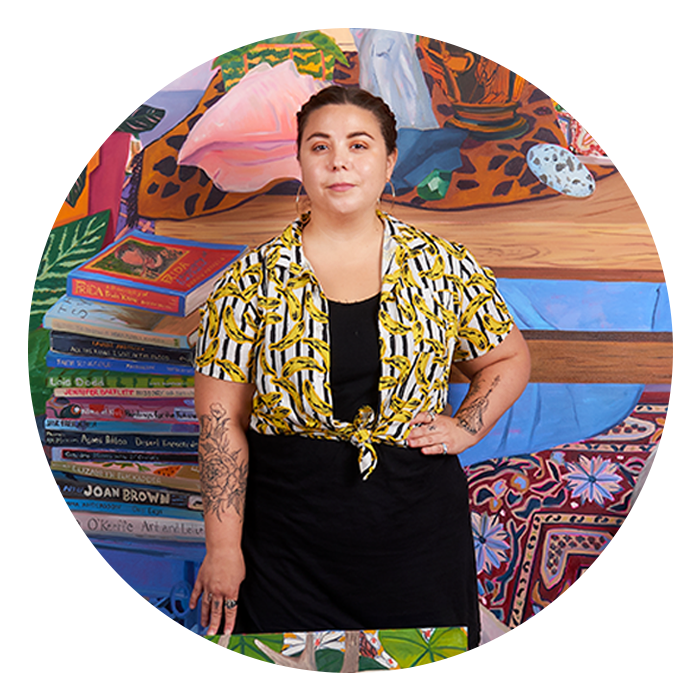 Anna Valdez is an Oakland, CA based artist who works across painting, ceramics, drawing, printmaking, collage, and digital media, to examine the relationship between material and cultural identity. Valdez incorporates articles found in domestic spaces such as plants, textiles, vessels and keepsakes into her work as a method of storytelling. Her colorful work invites the viewer to consider objects as emblematic of personal and collective experience, shifting between still life and portraiture.