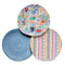 Capture the light and charm of the coastline with the Mediterranean Summer Woven Trivet Set. This artistic set of three 8-inch round cotton trivets features a vibrant, artist-designed pattern composed of charmingly framed vignettes, coastal creatures, and abstract blocks of color that evoke a sun-drenched European seaside town. This main design is complemented by a coordinating stripe pattern in muted tones and a solid blue woven texture.